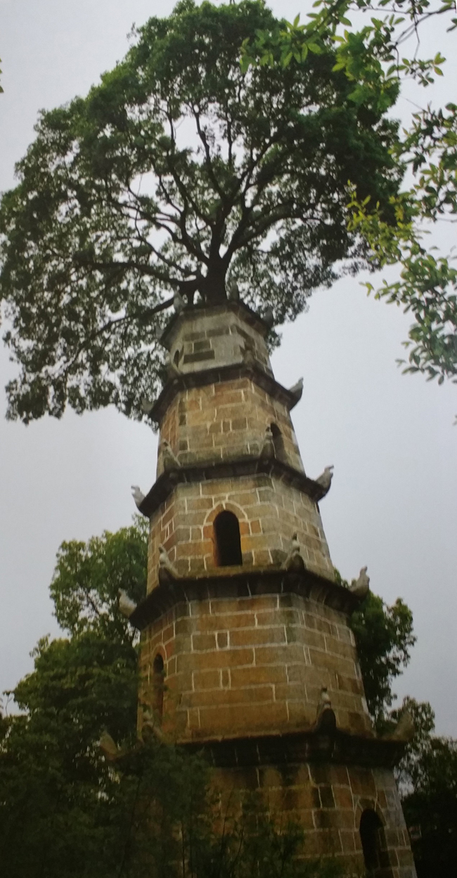 位于望城县茶亭镇惜字塔。盖塔建于清道光十八年,塔高12米,分五层,呈六边形,花岗岩砌成。塔身内空,设有石阶可旋至第三层。清光绪二十六年塔尖被雷击到,尔后长出朴树,树高6米,形如华盖,虽久经风雨,仍枝繁叶茂。因其在九峰山麓,夕阳西下,景色独具,故有"九峰夕照"的美称。