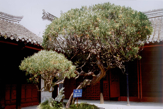 如皋水绘园内有一株落地盆景,称古桧,实为圆柏,人们通常称其为"六朝松"。该盆景株高5米,胸围87厘米,冠幅5米,树龄近千年,为如派盆景两弯半蟠扎技艺的典型代表作。据史料称,古桧为北宋大中祥符八年(1013年),宋文昭公曾易台和曾肇父子手植。这株千年古桧,树干光滑,有一深槽从基部向上延伸至顶部,外表纹路清晰,勾勒出整株造型的曲线美,从底部开始为左蟠右展,再右蟠左展,顶部呈辐射状纸条,张开大伞如云头,前大后小;向上看似大鹏展翅入云天,向下看似猛虎下山进森林;密密麻麻的细枝约数百支,又似微型森林小景观,整体看姿态曲、奇、傲、挺、苍。更为奇特的是此株古桧,叶片多种多样,有龙柏、侧柏、圆柏、刺柏的叶片,极为稀少,有着特殊的观赏价值。